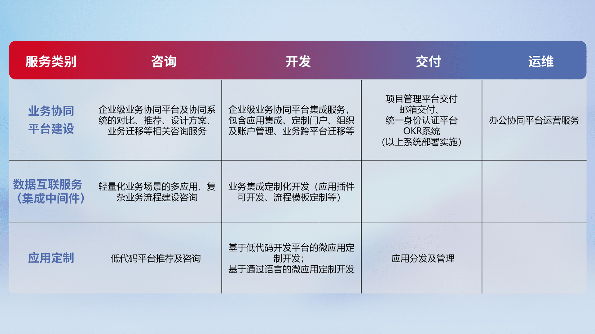 针对钉钉、、、、企微、、IDaas等平台级产品提供产品的规划、、、方案、、、交付、、定制化开发等服务,,,实现如统一协同办公、、、智能客户服务、、、混合会议管理、、、智能数据查询、、、、等业务场景,,实现数字化转型。。。。